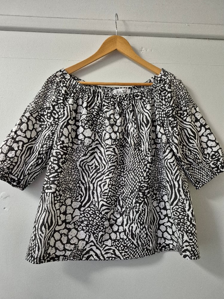 100% cotton relaxed fit top with elastic neckline and elbow length sleeves