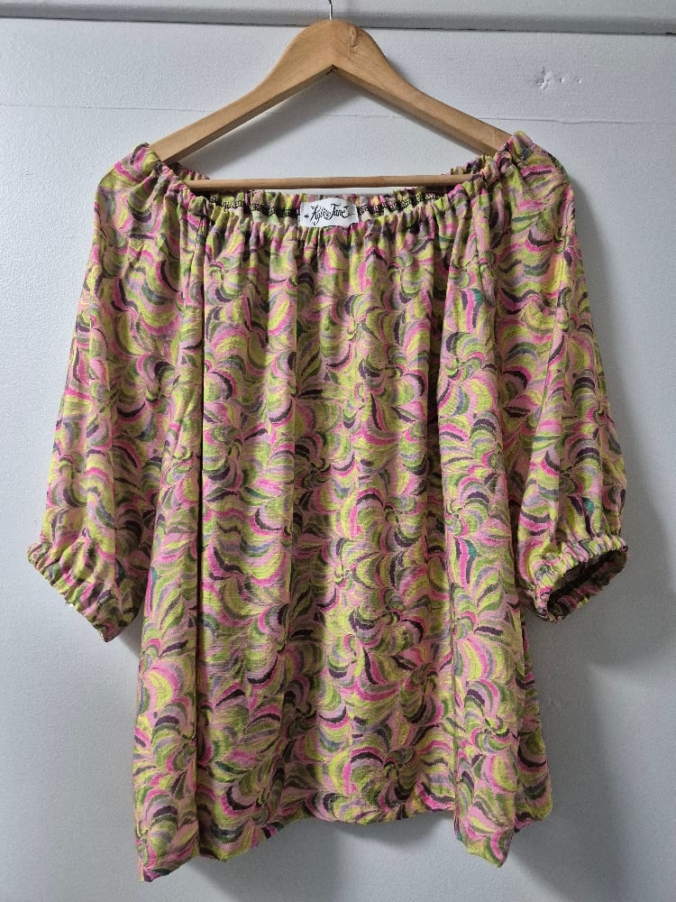 Beautiful lightweight cotton relaxed fit top with elastic neckline and elbow length sleeves.