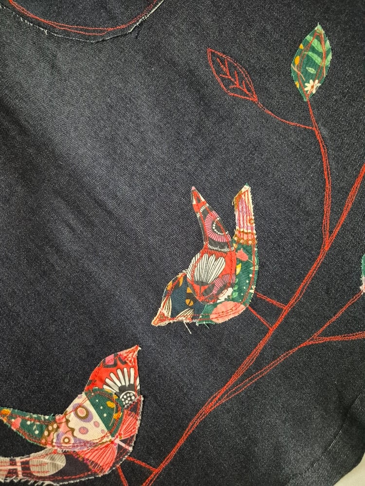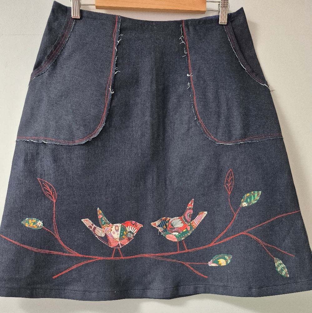 Cotton elastane aline skirt with raw edge front patch pockets and freehand embroidered patch birds and detail
