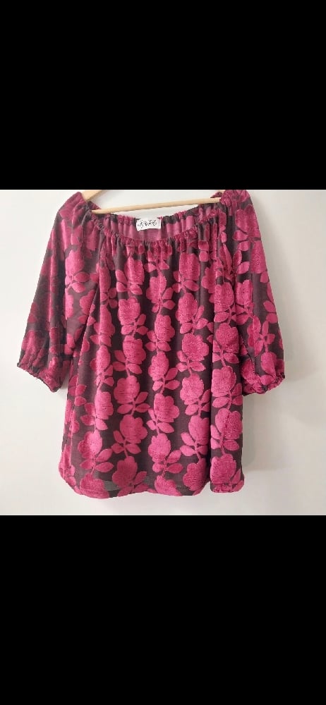 Textured flock velvet relaxed fit top with elastic neckline and elbow length sleeves