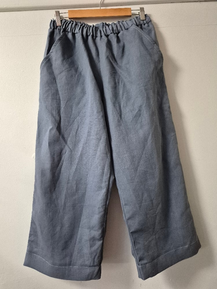 Cotton linen relaxed fit pants with front inset pockets and comfortable elastic waistband.