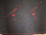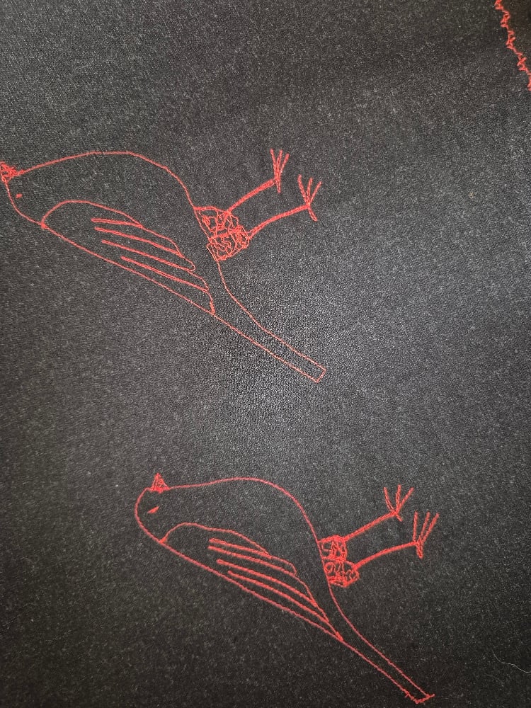 Cotton elastane denim aline skirt with raw edge front pockets and hem and freehand stitched birds in red.