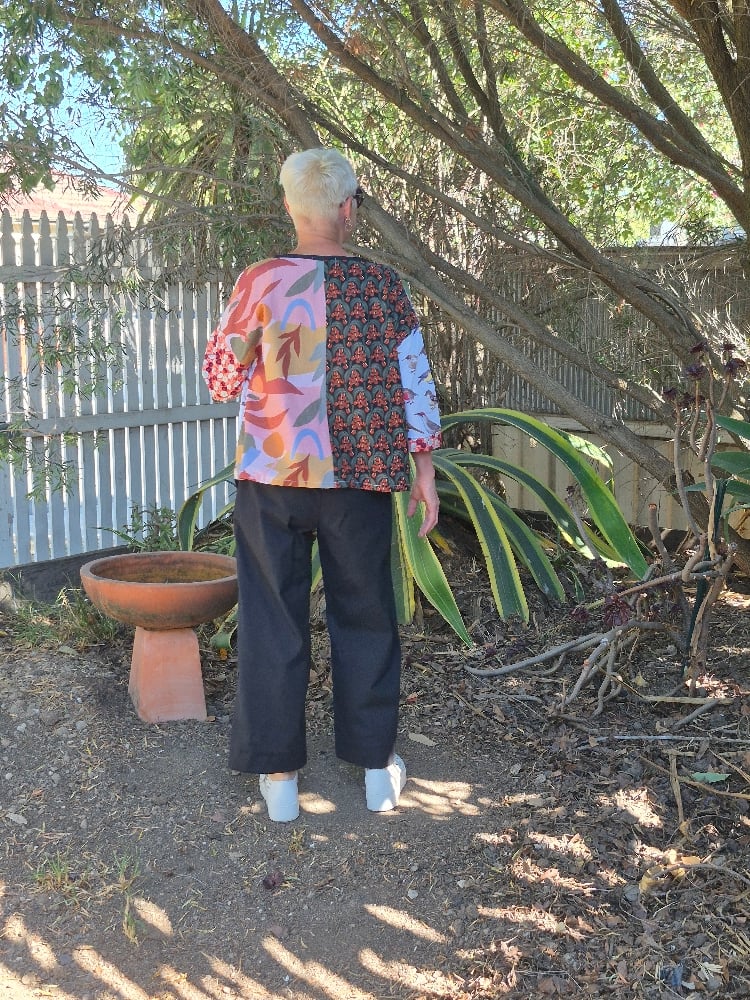 100% cotton relaxed fit top with dropped shoulder and 3/4 sleeves.