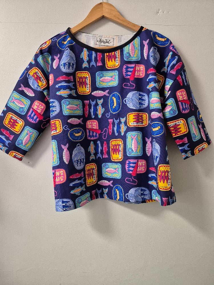 100% cotton relaxed fit top with dropped shoulder and 3/4 sleeves.