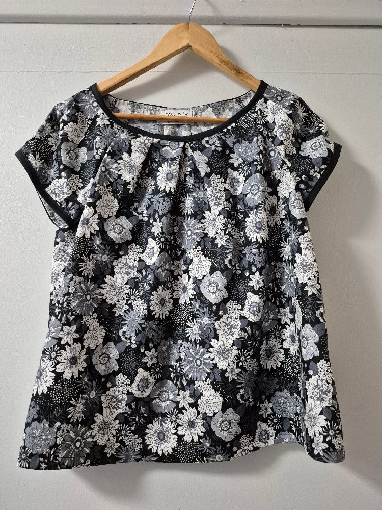 100% cotton relaxed fit top with pleat neckline and black sleeve and neck binding.
