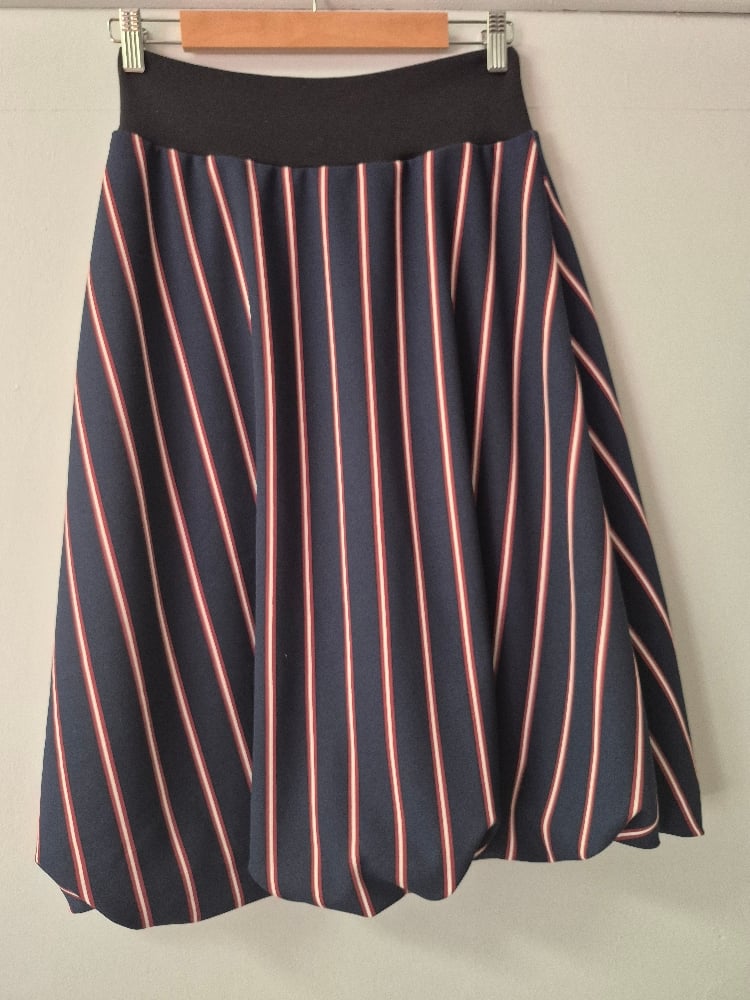 Ponte knit skirt with suprise contrast lining on the inverse gathered skirt.