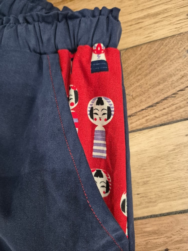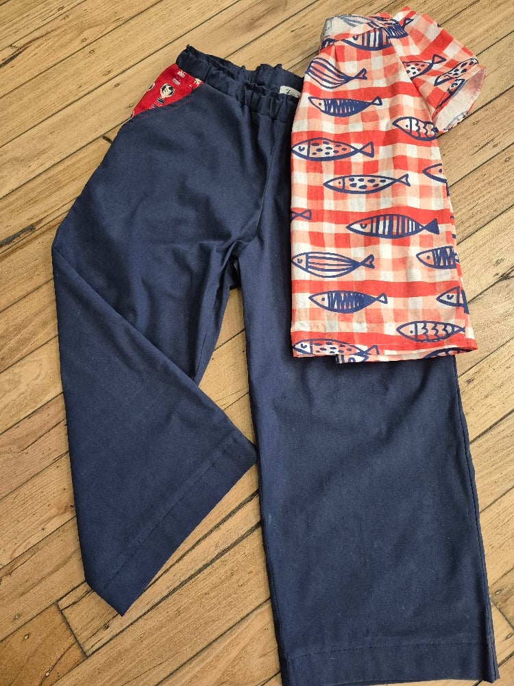 Stretch Cotton drill wide leg pants with front inset pockets and comfortable elastic waistband.