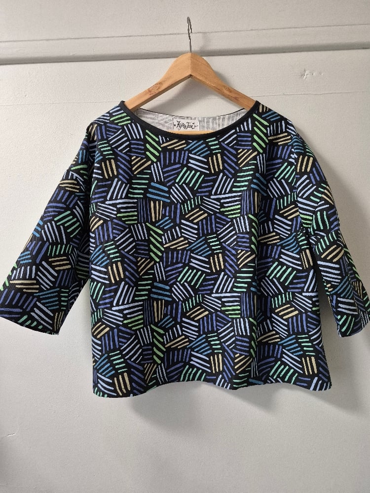 100% cotton relaxed fit top with dropped shoulder and 3/4 sleeves.